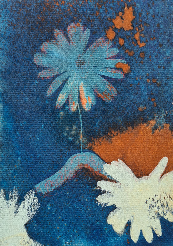 Eine Serie von Cyanotypien / Fotogrammen mit Pigmenten und wasserlöslichen Farben .